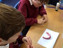 Our science work has focused on our digestive system: we started out with our teeth, making some very realistic sets to show the difference between molars, incisors and canines. We also carried out an investigation into the best (and worst) drinks for our teeth. Unsurprisingly, water was the best, but we found out that acid is very harmful. Don’t worry – we used eggshells for our experiments, not real teeth! We then moved on to the rest of the digestive system and learnt what happens to our food when we eat it, from start to finish!